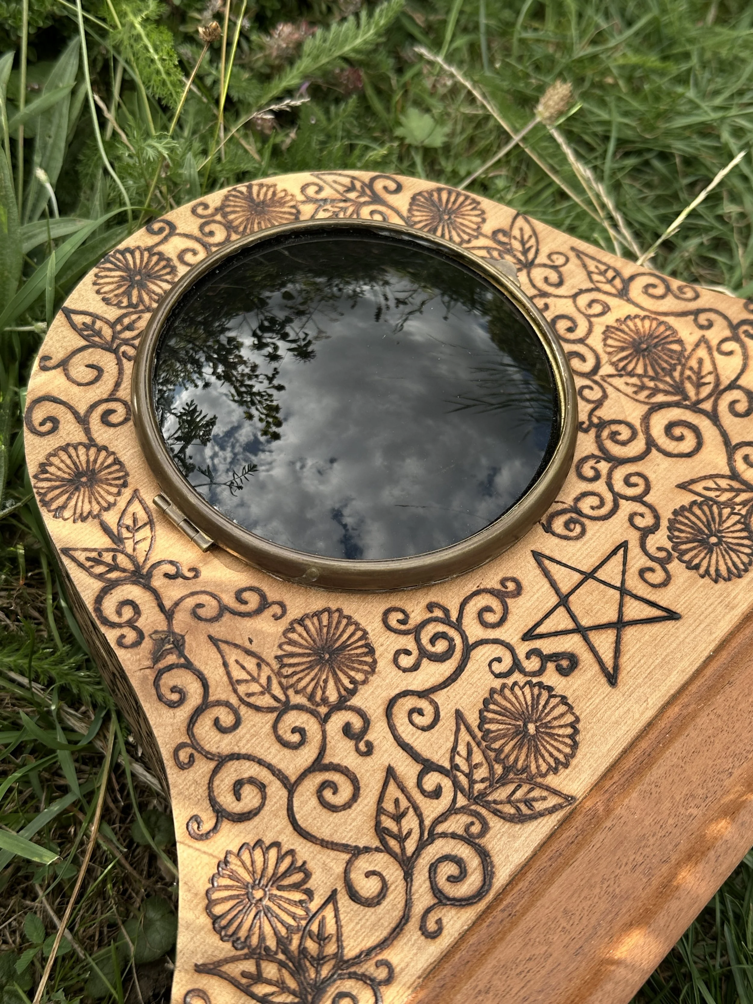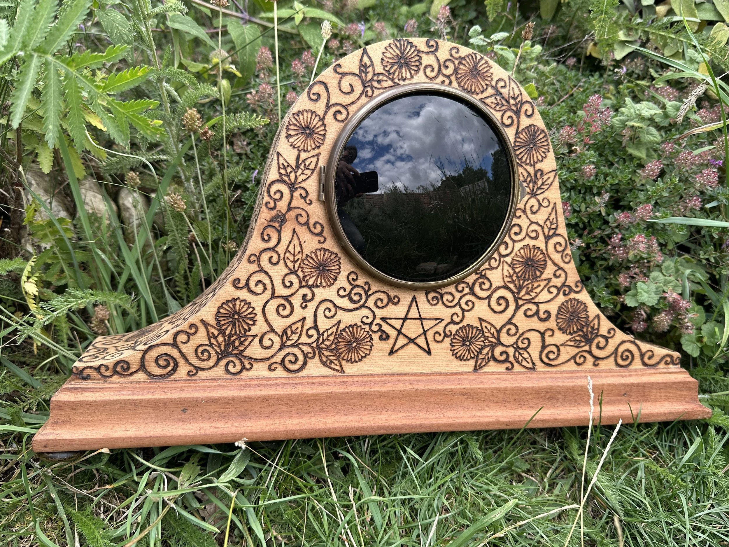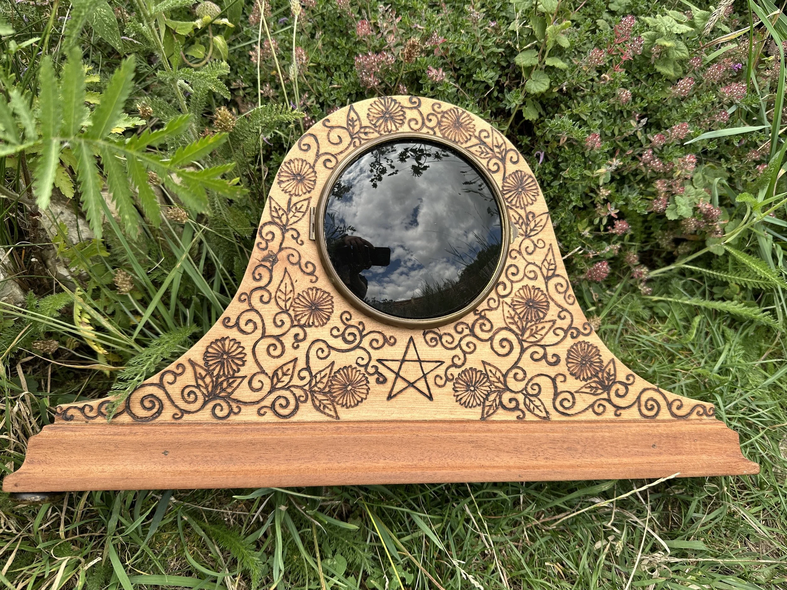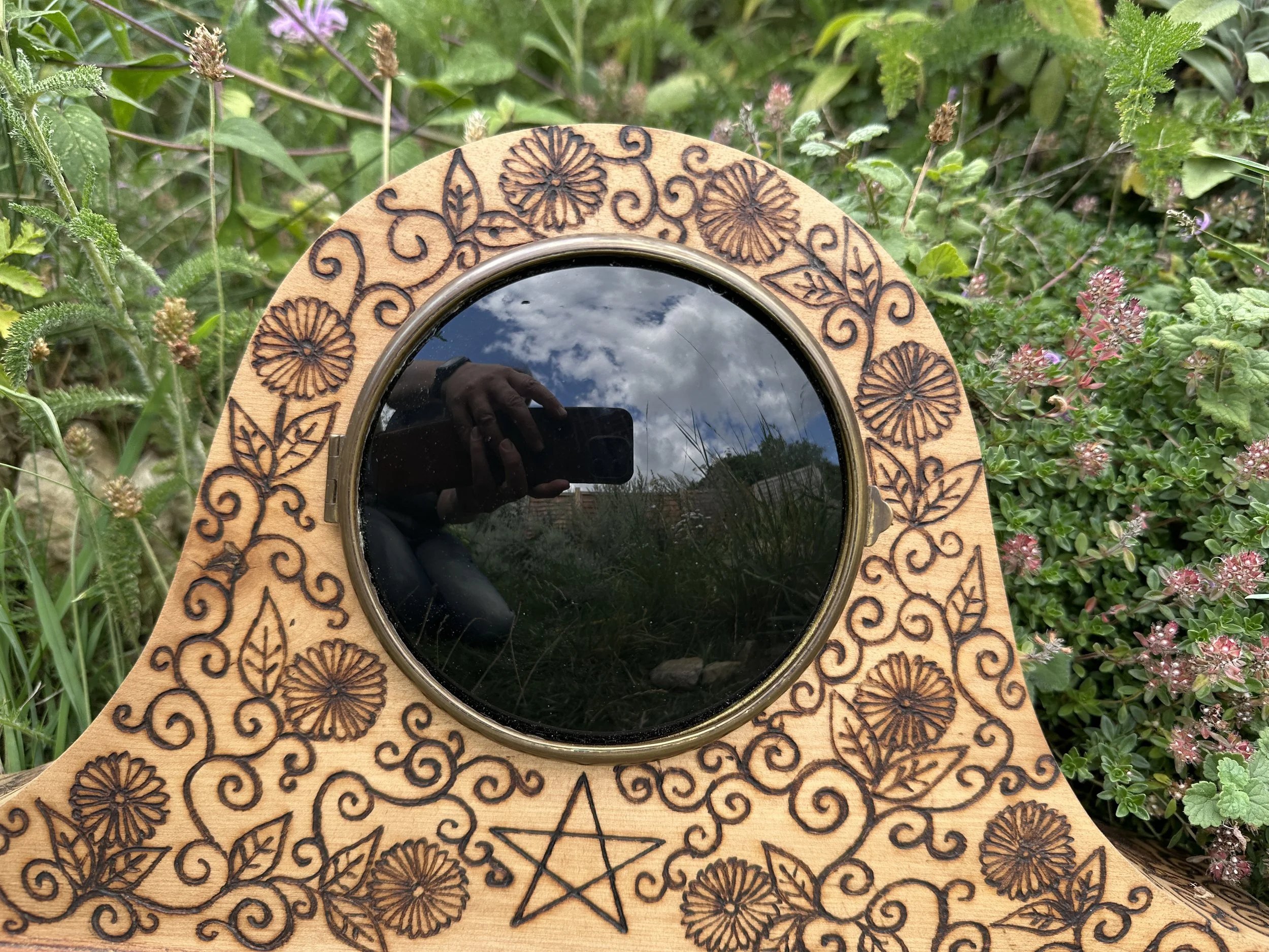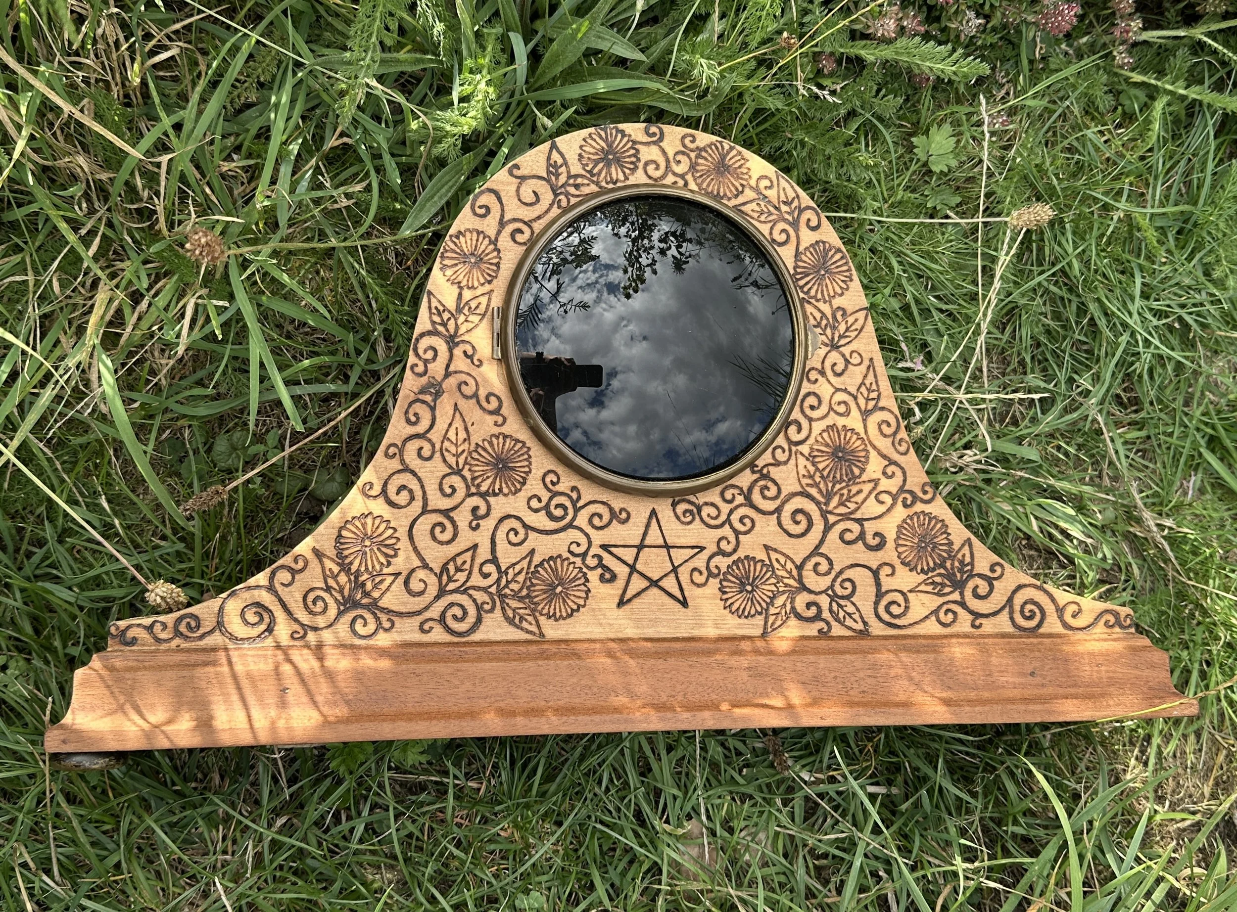 Behind the mirror are sealed herbs that I associate with scrying, and which I also use in the glass wash. One of the herbs is valerian root - which is pungent....some say it smells of old feet -I don't think the scent escapes!