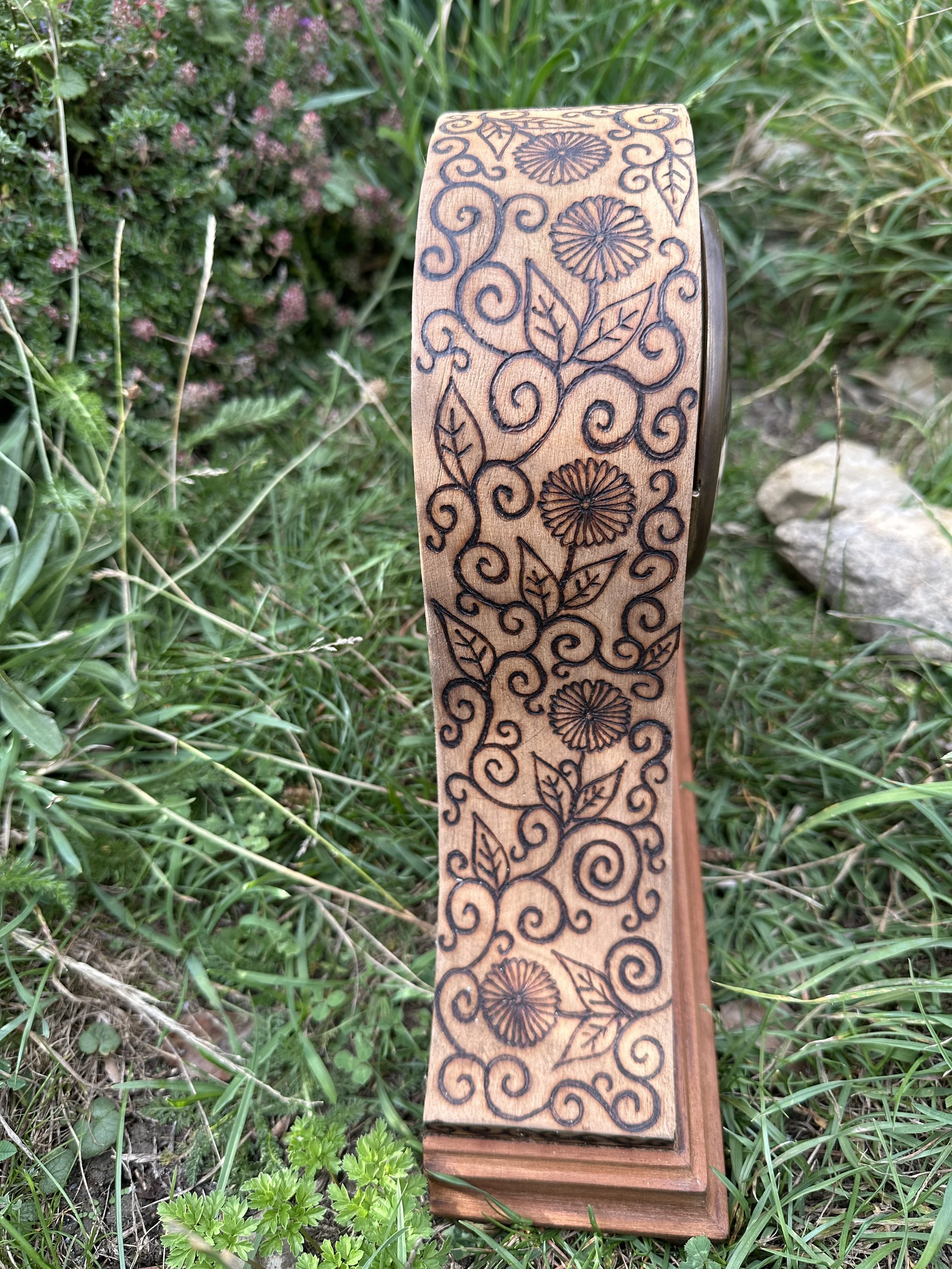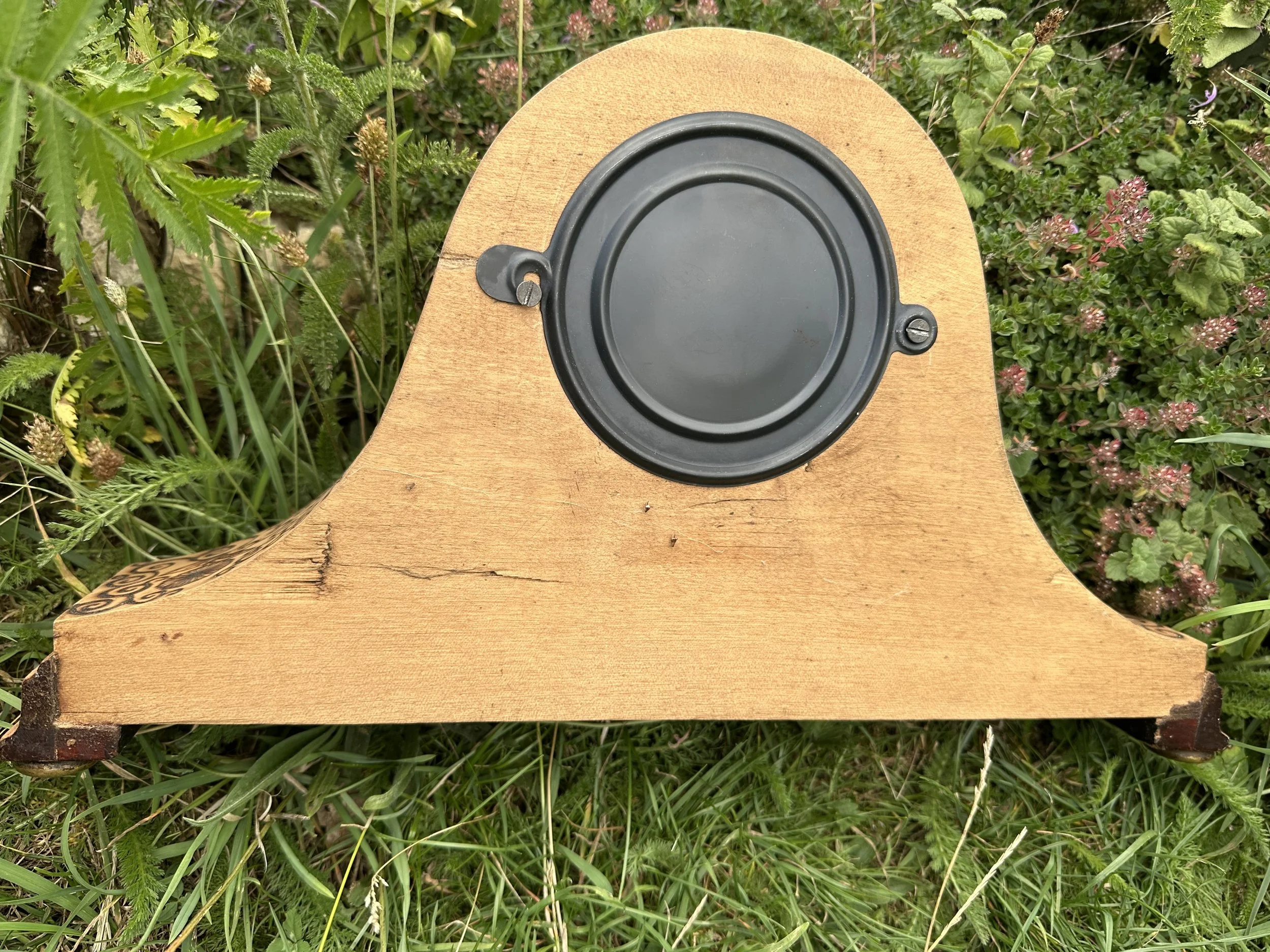The clock case is wood veneered and I've ornamented it with gold and copper detailing, and given it a good polish.
