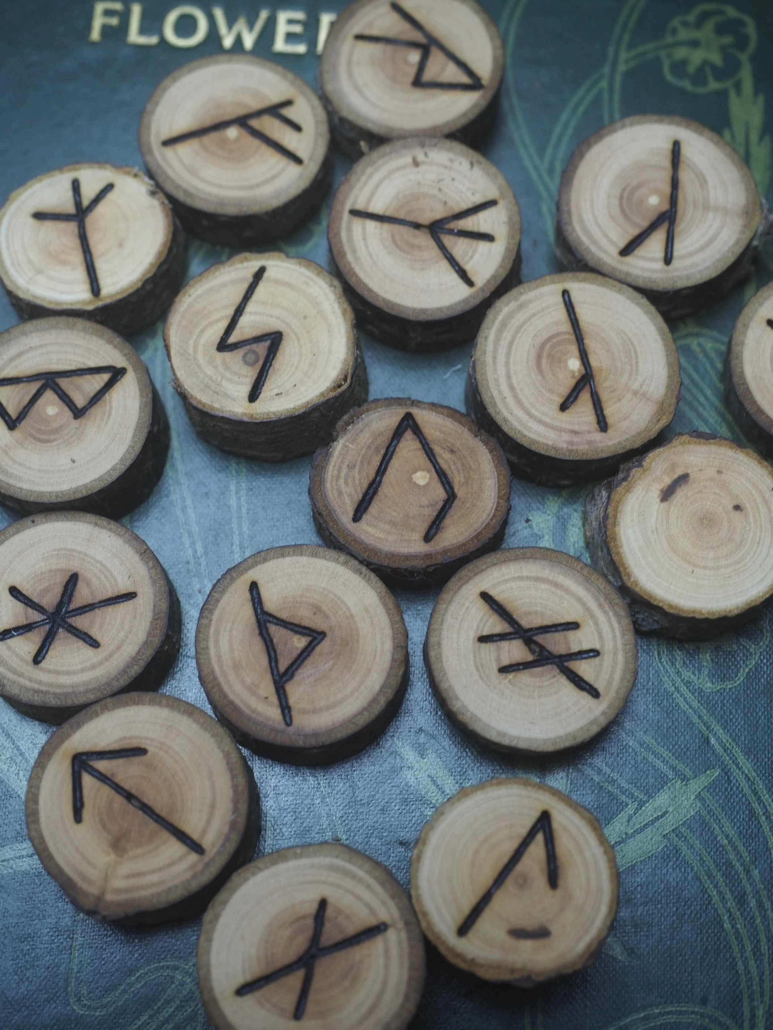 Raven of Greenwomancrafts has been making and using rune sets since they were a teenager. We offer Elder Futhark, Younger Futhark, Anglo Saxon and Northumbrian Runes and usually have a choice of woods and sizes available. Many of our rune sets are made to order - please contact Raven to discuss your needs. We also occasionally offer runes made from Bog Oak, stone, sea glass and Baltic Amber.